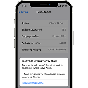 Αυτό το μήνυμα εμφανίζεται σε μοντέλα iPhone 11 ή μεταγενέστερα. Ενδέχεται να εμφανίζεται μια πρόσθετη γνωστοποίηση που αναφέρει «Η Apple ενημέρωσε τις πληροφορίες συσκευής για αυτό το iPhone». Αυτό σημαίνει ότι η Apple έχει ενημερώσει τις πληροφορίες συσκευής που διατηρούνται για το iPhone σας για τις ανάγκες σέρβις, την ανάλυση ασφάλειας και τη βελτίωση μελλοντικών προϊόντων.